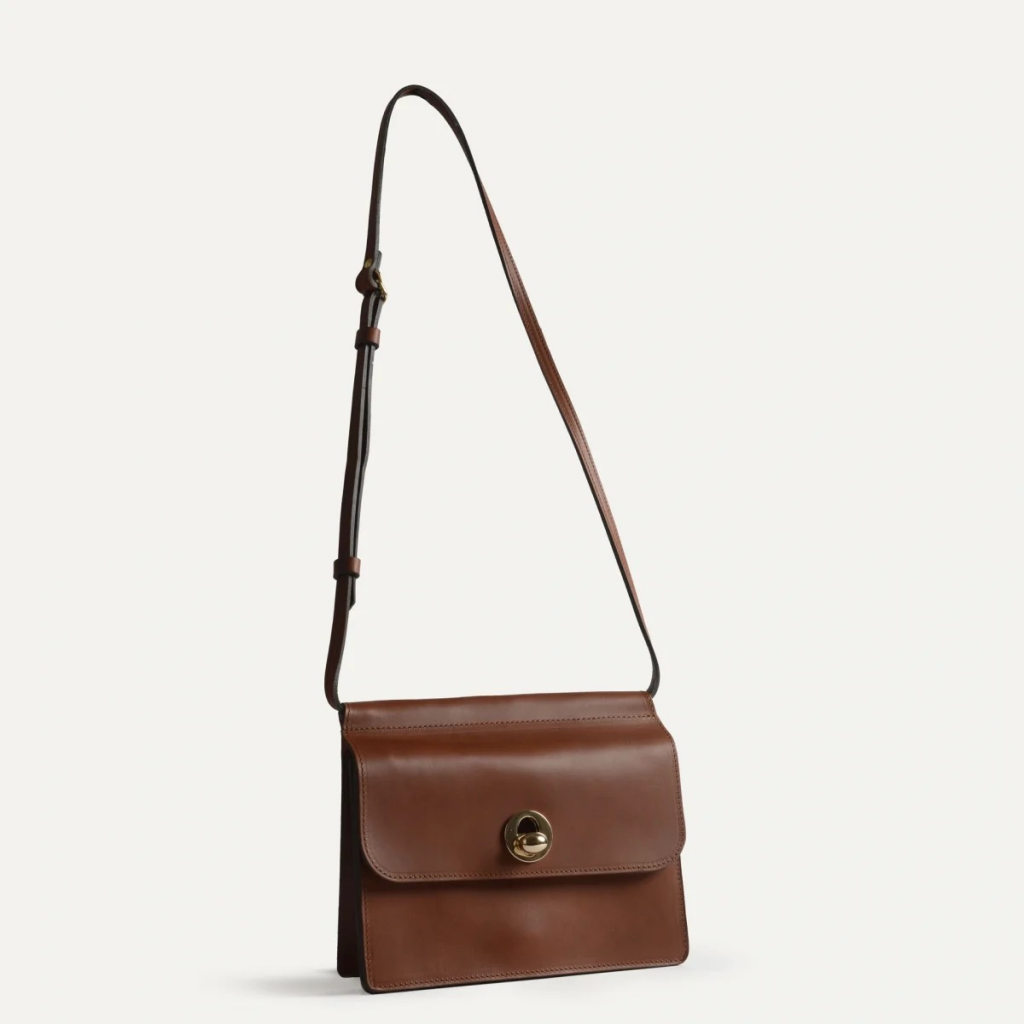 Inspirée des sacoches urbaines des années 60, la sacoche Bleu de Chauffe revisite le mini-cartable dans un esprit féminin, structuré et raffiné. Son format compact, sa construction à soufflet et sa serrure tourniquet finition or pâle en font une pièce à la fois intemporelle et singulière.